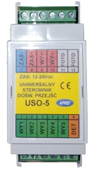 Sterownik USO-5 jest przeznaczony do sterowania sygnalizacją ostrzegawczą i doświetleniem przejść dla pieszych. Sterownik USO-5 zawiera trzy kanały sterujące oświetleniem.Wykonywany jest na napięcie zasilania 24V i 12V prądu stałego. Przeznaczony jest do sterowania systemami LED. Elementami wykonawczymi są tranzystory VMOS sterowane mikroprocesorem co zapewnia dużą niezawodność i trwałość. Sterownik wyposażony jest w trzy kanały sterujące. Kanał pierwszy LO (Lampy Ostrzegawcze) posiada dwa wyjścia i służy do naprzemiennego lub jednoczesnego sterowania pulsowaniem lamp ostrzegawczych montowanych przy lub w znaku D-6. Kanał drugi KO (Kocie Oczka) posiada dwa wyjścia przeznaczone do sterowania oświetleniem ostrzegawczym typu ''kocie oczka'' montowanym w jezdni. Działanie tego kanału jest aktywowane czujnikiem ruchu. Kanał trzeci DP (Doświetlenie Przejścia) posiada jedno wyjście przeznaczone do sterownia lampą doświetlającą przejście. Działanie tego kanału jest aktywowane czujnikiem ruchu o zmierzchu. Sterownik USO-5 jest funkcjonalnym zamiennikiem analogicznego sterownika firmy DVS.